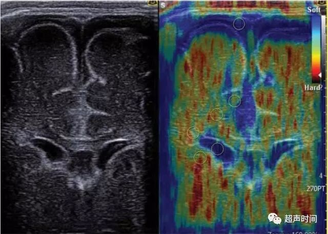 图 1 新生儿大脑弹性成像图。左图为经双侧侧脑室的冠状面二维超声图,右侧为该平面的超声弹性成像图,并在脑部各部位选出感兴趣区(白色圆圈)。红色表示弹性最弱(组织最硬),蓝色表示弹性最强(组织最软)