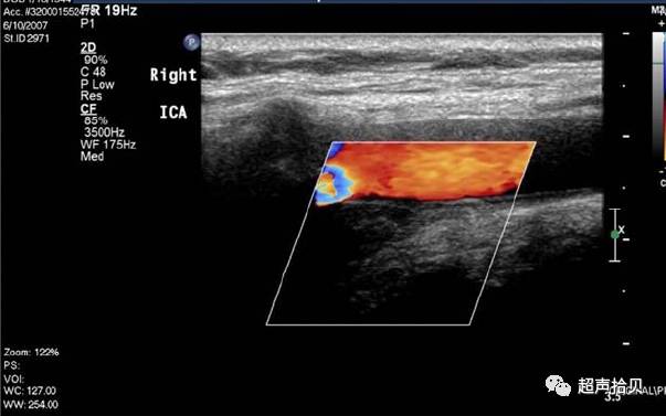 图3,女,71岁;颈总动脉A,远端低回声增厚。 B,彩色多普勒在局灶性增厚中没有显示可检测的血流的;ICA 颈内动脉