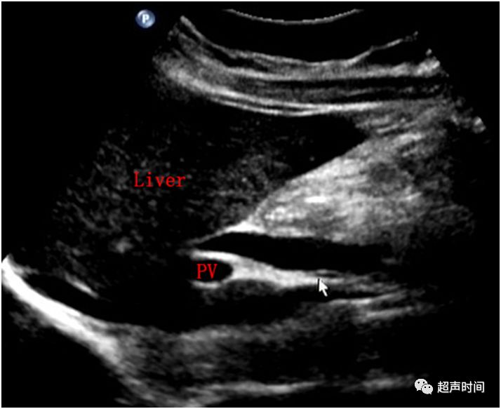 图 3 肝门处胆管轻度扩张,管壁光滑,管壁内回声清晰(白色箭头)。PV:门静脉
