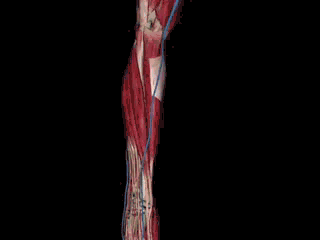 静脉:头静脉、贵要静脉、肘正中静脉位于浅层,皮肤与肌肉之间,无动脉伴行,头静脉走行于桡侧,贵要静脉走行于尺侧。肘正中静脉为一短粗的静脉干,在肘窝处连接头静脉和贵要静脉(视频 1 和图 1 和图 2)。