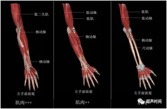 动脉:肱动脉、桡动脉位于较深层,肌肉与肌肉之间,有对应静脉伴行。桡动脉在肘窝位置及腕部最为表浅(图 2)。